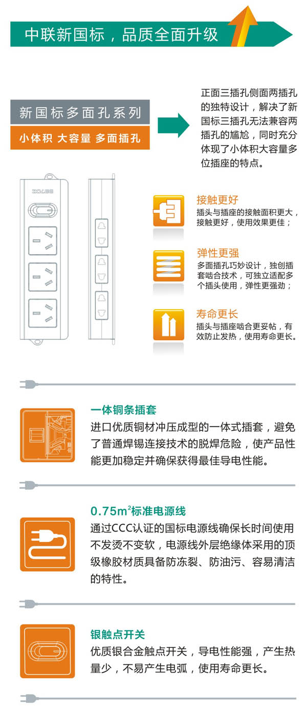 中聯(lián)國標多面孔系列插座正面三插孔側(cè)面兩插孔的獨特設(shè)計,解決了新國標三插孔無法兼容兩插孔的尷尬,同時充分體現(xiàn)了小體積大容量多位插座的特點。 接觸更好 插頭與插座的接觸面積更大,接觸更好,使用效果更佳;彈性更強 多面插孔巧妙設(shè)計,獨創(chuàng)插套齒合技術(shù),可獨立適配多個插頭使用,彈性更強勁; 壽命更長 插頭與插座齒合更妥帖,有效防止發(fā)熱,使用壽命更長。